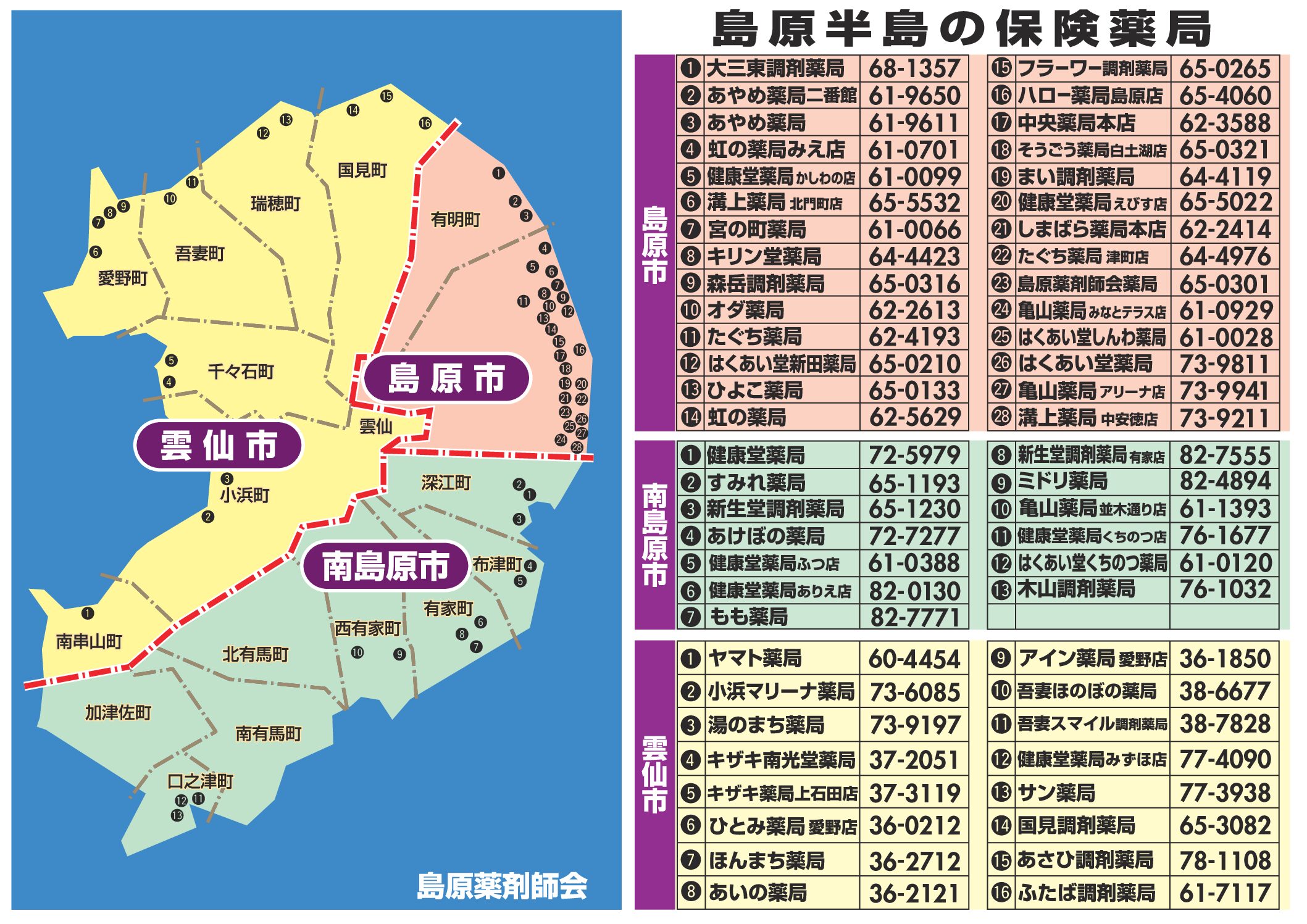 | はくあい堂薬局 | 保険薬局 | 855-0862 | 島原市新湊1丁目42 | 0957-73-9811 |